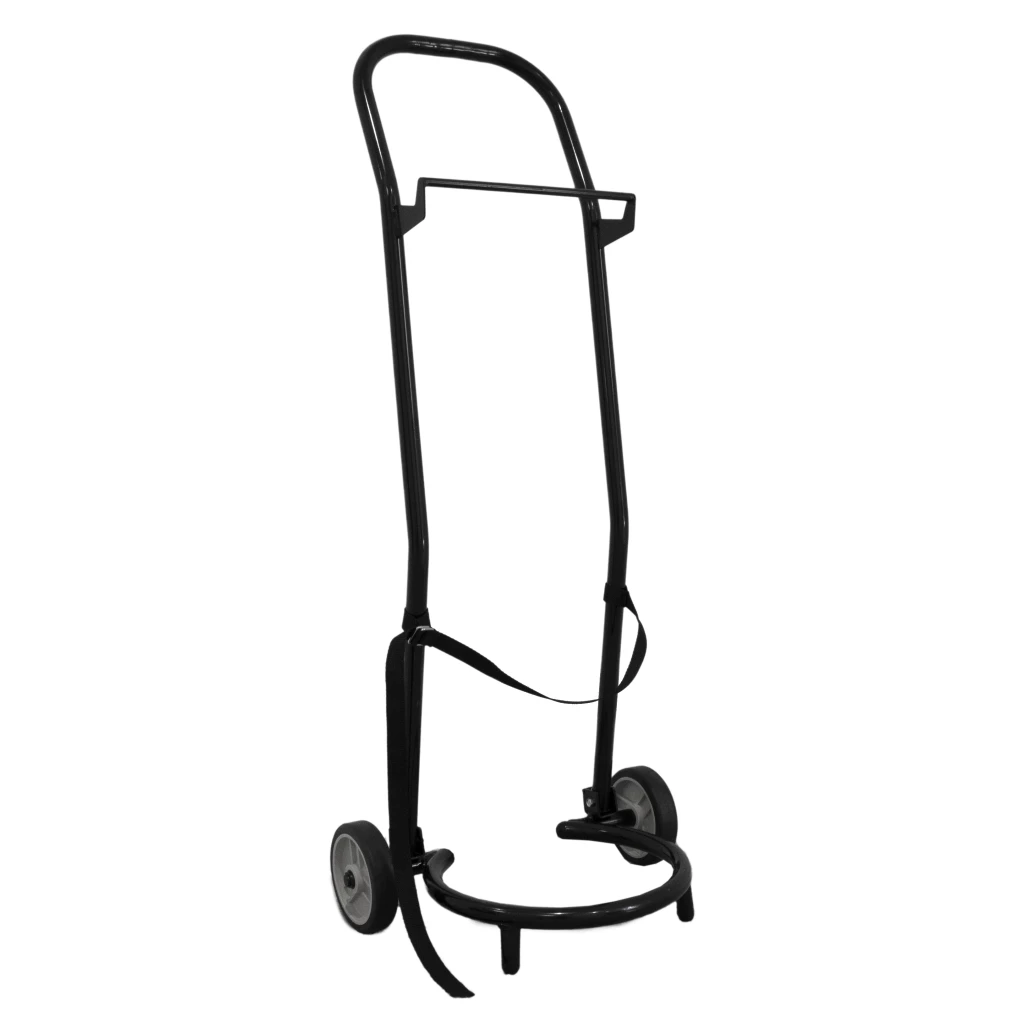 Mobiler Wagen zum einfachen Bewegen des Cow Drenchers, in einem ergonomischen und stabilen Design. Einfach zu falten und zu lagern. Mit Halter für Fass und Schlauch.