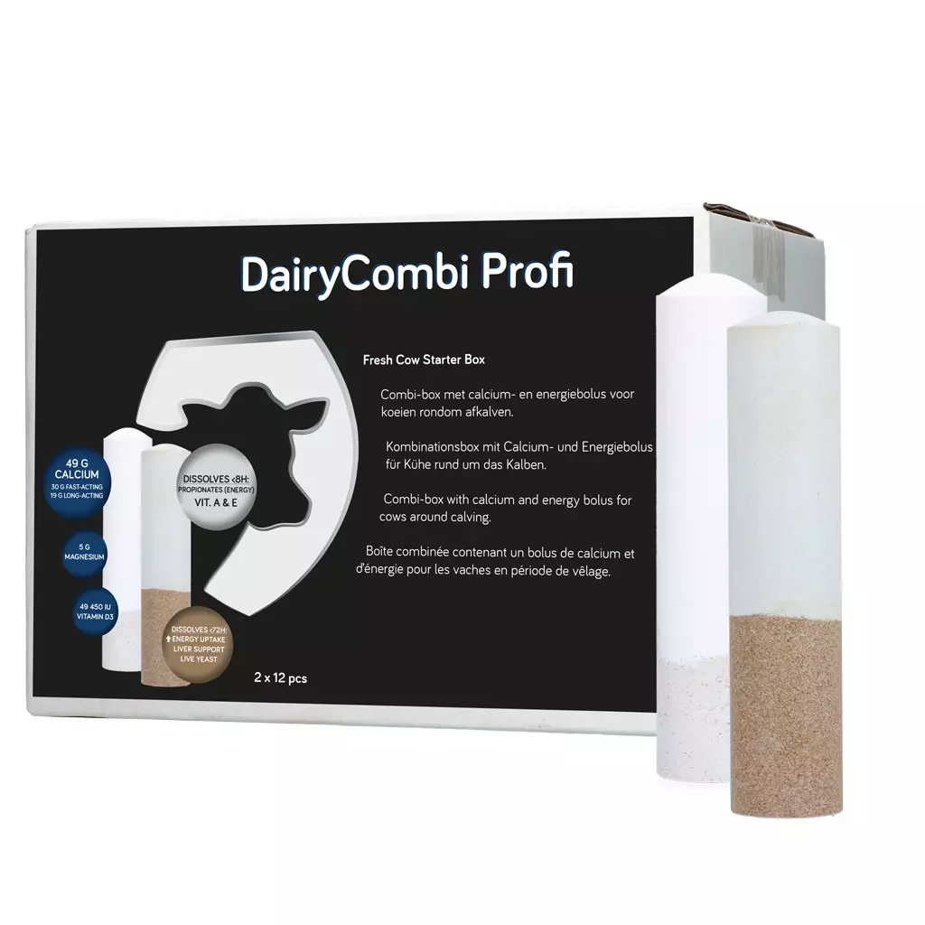 DairyCalc Profi (weiße Kappe) ist ein Ergänzungsfuttermittel (Mineral-Diätfuttermittel) zur Verringerung des Risikos für Milchfieber und subklinische Hypokalzämie. Es ist eine Quelle gut aufnehmbaren Calciums (schnell- und langwirkend) und unterstützt in Kombination mit Magnesium und Vitamin D3 den Calciumstoffwechsel.
